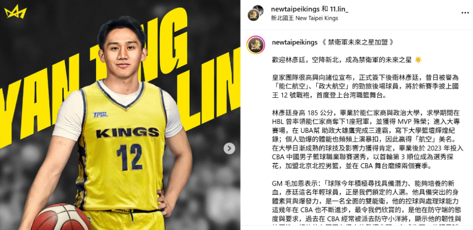 37岁的林书豪在此前已经宣布退役,过去两个赛季林书豪连续率领新北国王夺冠。在林书豪退役之后,林彦廷告别CBA加盟新北国王,自然是为了填补林书豪退役的空缺。